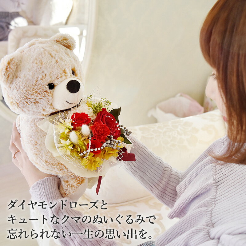 ソエルフラワーズの花贈りカレンダー1月お正月 お年賀 成人の日 愛妻の日 (1月31日)2月バレンタインデー (2月14日)3月ホワイトデー (3月14日) 卒業祝い 送別 退職祝い 離任式 春のお彼岸4月入学祝い 入社祝い 就職祝い5月母の日/節句のお祝い 告白の日 (5月9日)6月父の日 恋人の日 (6月12日)7月初盆 (新盆) お中元8月初盆 (旧盆) 9月秋のお彼岸/敬老の日 メンズバレンタインデー (9月14日)10月ハロウィン (10月31日)11月七五三 いい夫婦の日 (11月22日)12月ダズンローズデー (12月12日) お歳暮 クリスマス (12月25日) 特別な日のプレゼントにプロポーズ 告白 誕生日 誕生日プレゼント バースデー サプライズ 結婚記念日金婚式 銀婚式 ダイヤモンド婚式 花婚式 贈り物結婚祝い 結婚内祝い 結婚式 ウェディング ブライダル 楽屋花 コンサート オープン記念 記念品 記念日 内祝い フラワーギフト 法人ギフト 開店祝い 開業祝い 周年祝い 引っ越し祝い 新築祝い 移転祝い 卒業祝い 歓送迎会 楽屋見舞い 差し入れ 発表会 友達 恋人 本命 彼女 女性 彼氏 妻 嫁 旦那 夫 プリザーブドフラワー 間違われる名称: ブリザーブドフラワー ブリザーブドフラワー プリザーブドフラワー 商品名 くまのマックスとダイヤモンドローズアレンジ サイズ くまのぬいぐるみ:高さ約24cm/横幅21cm 花束:高さ約16cm/横幅13cm スペック ・くまのぬいぐるみとアレンジメントは取り外しが可能です。
