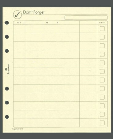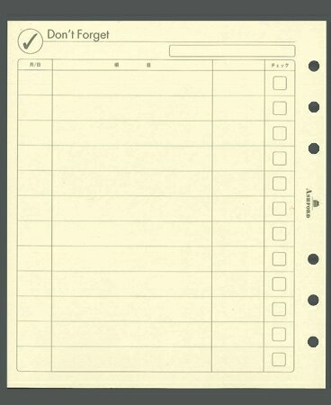 商品名・ドントフォゲット 30枚 HB×WA5詳細・種類 :システム手帳リフィル・品番 :35036_6615-100・サイズ :HB×WA5 (6穴)・メーカー名 :ASHFORD / アシュフォード・商品説明忘れてはいけない重要事項を項目別にチェックできるリフィルです。